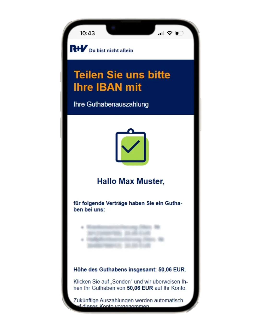 Wir kontaktieren Kund*innen unkompliziert und bitten um Hinterlegung ihrer aktuellen Bankverbindung. Die übermittelte IBAN wird automatisch geprüft und validiert; alternativ können sie die bereits vorliegende Bankverbindung einfach prüfen und bestätigen. So laufen Auszahlungen schnell, korrekt und rechtssicher – ohne Schecks und ohne Umwege.